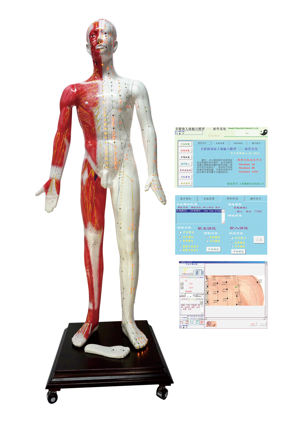 多媒體人體針灸穴位發光模型... 該系統融計算機技術、電子控制技術、多媒體技術、腧穴理論于一體;聲音、屏幕、人體模型同步控制筋絡腧穴的信息;顯示十二經脈循環流注,經脈絡屬表理對經關系,特定穴的分布;加之屏幕表層、淺層、深層穴位解剖圖的配合,常見病的辯施治,隨證選穴的查詢及處理輸出,使學員對人體經絡腧穴信息有更全方位的了解,更有利于加深印象與理解掌握;同時,亦可用于臨床與科研參考。